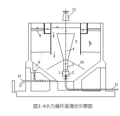 水、混凝劑和回流的泥渣在混合室和喉管內(nèi)快速、充分混合與反應(yīng)?;旌虾蟮乃牧鞒膛c機械加速澄清池相似,即由第一反應(yīng)室→第二反應(yīng)室→分離室→集水系統(tǒng)。從分離室沉下來的泥渣大部分回流再循環(huán),少部分泥渣進入泥渣濃縮室濃縮后排出池外。