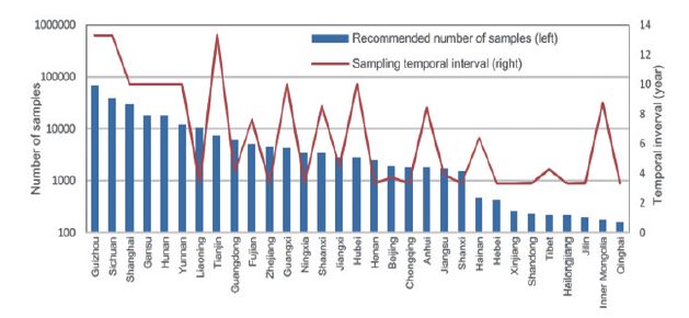 土壤重金屬污染是動(dòng)態(tài)變化的,重金屬濃度隨污染源的輸入和植物吸收、流水等作用輸出的變化而變化。如何在時(shí)間和空間上監(jiān)測土壤重金屬污染狀況的變化特征亦是一個(gè)不可忽視的重要問題。通過對(duì)前一次樣點(diǎn)的定位,再次采集、分析,比較同一樣點(diǎn)前后兩次土壤重金屬濃度的變化,是最為有效的監(jiān)測土壤重金屬變化的方式。但因土壤的空間異質(zhì)性、采樣方法和統(tǒng)計(jì)誤差等影響,土壤重金屬濃度變異度的數(shù)值大小可以通過再次采樣而被檢測是需要考慮的問題。同時(shí),多次大量的樣品采集雖然能夠提高監(jiān)測精度,但成本也相應(yīng)升高,在操作上不現(xiàn)實(shí)。監(jiān)測精度和成本的平衡,監(jiān)測區(qū)域樣品數(shù)量和監(jiān)測時(shí)間間隔的確定是至關(guān)重要的問題。中國地質(zhì)大學(xué)Xia等在全國土壤調(diào)查的基礎(chǔ)上,以主要行政區(qū)域和主要重金屬污染元素為對(duì)象,研究土壤重金屬污染變化監(jiān)測的樣品采集數(shù)量和采集時(shí)間間隔,發(fā)現(xiàn)由于研究區(qū)域大的空間變異,很難確定土壤重金屬濃度最小可監(jiān)測的變異;根據(jù)成本、可實(shí)踐性和檢測的精度,考慮重金屬元素的變異性和設(shè)定變異程度,針對(duì)不同區(qū)域推薦了一系列合適采樣數(shù)量,不同區(qū)域檢測的時(shí)間間隔為3.3~13.3年(圖1)。該研究為區(qū)域性土壤重金屬污染變化監(jiān)測提供較好的研究思路和方法。