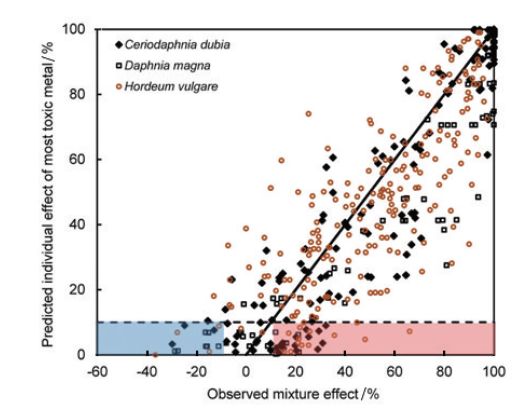 圖2重金屬復(fù)合污染條件下模型預(yù)測和觀測的毒性對(duì)比