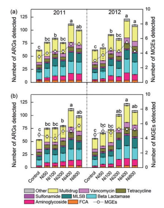 抗生素對(duì)細(xì)菌感染、致病微生物感染類疾病的防治具有重要作用,但由此而來的抗性基因的快速增加和傳播也威脅著人體健康。抗性基因的研究越發(fā)受到學(xué)者關(guān)注,成為研究熱點(diǎn)。除抗生素選擇產(chǎn)生抗性基因外,環(huán)境中重金屬對(duì)抗生素抗性的選擇和傳播擴(kuò)散具有重要作用。中國科學(xué)院生態(tài)環(huán)境研究中心Hu等通過對(duì)Ni長期污染土壤誘導(dǎo)的抗性基因進(jìn)行研究,發(fā)現(xiàn)在長期不同程度Ni污染下,共檢測到149種抗性基因,以多藥和β-內(nèi)酰胺類抗生素抗性為主,抗性基因的頻率和豐度隨Ni污染程度的增加而升高(圖3);抗性基因與可移動(dòng)抗性原件具有顯著相關(guān)性,表明Ni污染增加了抗性基因的水平轉(zhuǎn)移,該水平轉(zhuǎn)移與intI1整合子有關(guān)。區(qū)別于以往重金屬的直接毒性風(fēng)險(xiǎn),該研究闡述了重金屬在土壤環(huán)境中的間接風(fēng)險(xiǎn)-增加抗性基因產(chǎn)生和傳播風(fēng)險(xiǎn)。