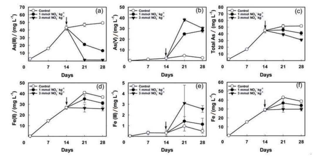 圖4硝酸鹽加入后土壤溶液As和Fe形態(tài)變化