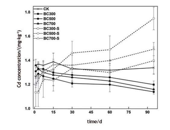 圖8不同培養(yǎng)時(shí)間下生物炭(BC300,BC500,BC700)和改性生物炭(BC300-S,BC500-S,BC700-S)對(duì)土壤全量Cd濃度變化的影響