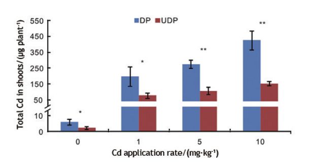 圖7去頂(DP)和不去頂(UDP)處理植物對(duì)Cd吸收
