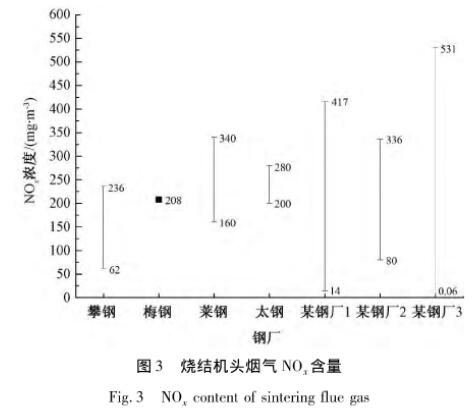 由燒結(jié)燃料(煤粉、焦粉)燃燒產(chǎn)生的燃料型NO,占燒結(jié)煙氣中NOx的90%以上。見圖3,我國燒結(jié)煙氣中NOx含量為100~500mg/m3,波動(dòng)較大。目前,燒結(jié)煙氣脫硝主要以活性炭/焦吸附為主。