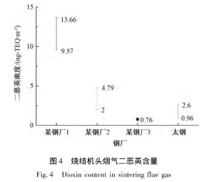 燒結(jié)過程中的二惡英主要由“從頭合成”途徑生成。燒結(jié)原料中含有的Fe、Cu、Cl等元素提供了催化劑和氯源;燃料的不充分燃燒提供了大分子碳源;燒結(jié)過程漏風(fēng)率高,含氧充足,在250~450℃,二惡英的“從頭合成”得以發(fā)生。目前國內(nèi)關(guān)于燒結(jié)煙氣中二惡英含量的報(bào)道較少,如圖4所示,不同燒結(jié)煙氣的二惡英排放量差別很大,可能跟原料與工況有關(guān)。
