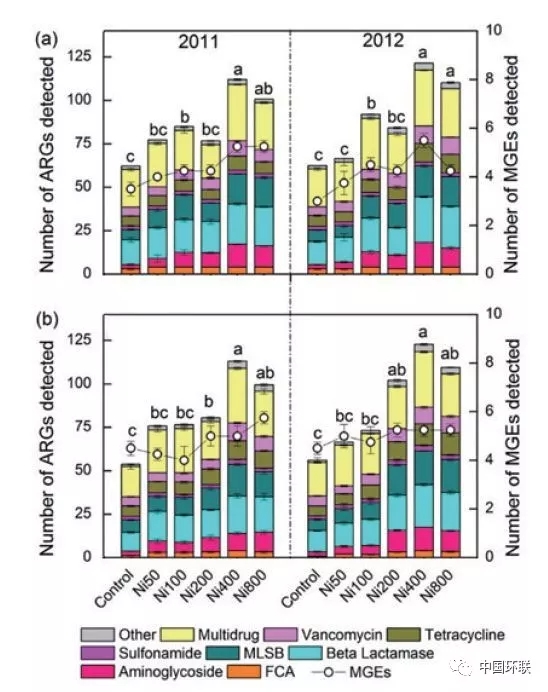 抗生素對細(xì)菌感染、致病微生物感染類疾病的防治具有重要作用,但由此而來的抗性基因的快速增加和傳播也威脅著人體健康??剐曰虻难芯吭桨l(fā)受到學(xué)者關(guān)注,成為研究熱點(diǎn)。除抗生素選擇產(chǎn)生抗性基因外,環(huán)境中重金屬對抗生素抗性的選擇和傳播擴(kuò)散具有重要作用。中國科學(xué)院生態(tài)環(huán)境研究中心Hu等通過對Ni長期污染土壤誘導(dǎo)的抗性基因進(jìn)行研究,發(fā)現(xiàn)在長期不同程度Ni污染下,共檢測到149種抗性基因,以多藥和β-內(nèi)酰胺類抗生素抗性為主,抗性基因的頻率和豐度隨Ni污染程度的增加而升高(圖3);抗性基因與可移動(dòng)抗性原件具有顯著相關(guān)性,表明Ni污染增加了抗性基因的水平轉(zhuǎn)移,該水平轉(zhuǎn)移與intI1整合子有關(guān)。區(qū)別于以往重金屬的直接毒性風(fēng)險(xiǎn),該研究闡述了重金屬在土壤環(huán)境中的間接風(fēng)險(xiǎn)-增加抗性基因產(chǎn)生和傳播風(fēng)險(xiǎn)。