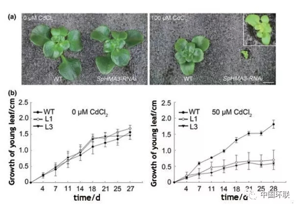 利用超積累植物修復(fù)重金屬污染土壤一直是研究學(xué)者們關(guān)注的焦點(diǎn)。區(qū)別于普通植物,超積累植物地上部可富集高濃度的重金屬。其可能作用機(jī)制為:超積累植物的根際對土壤重金屬活化效應(yīng);超積累植物對重金屬具有快速的吸收轉(zhuǎn)運(yùn)體系;超積累植物對重金屬具有強(qiáng)的解毒儲存能力。浙江大學(xué)Hou等對比研究重金屬超積累型和非超積累型植物的根際特征,發(fā)現(xiàn)與非超積累型植物相比,超積累型植物根際具有更為龐大的根系,土壤pH值較低,重金屬有效性高;根際土壤重金屬有效性與超積累植物特異的細(xì)菌群落具有顯著相關(guān)性,微生物群落功能分析(PICRUSt)超積累植物根際細(xì)菌豐度相對較高,其相應(yīng)的功能與膜運(yùn)輸和氨基酸代謝相關(guān)。該研究揭示了超積累植物根際特征,尤其是特異的根際細(xì)菌群落組成對超積累植物吸收重金屬的作用。除超積累植物特殊的根際效應(yīng)外,其植物本身對重金屬吸收和存儲能力亦是超積累重金屬主要機(jī)制。浙江大學(xué)Tian等對超積累型和非積累型東南景天對Cd吸收、分布以及細(xì)胞水平上耐性進(jìn)行研究。Cd在非積累型植物葉和莖中維管束中有少量分布,而超積累植物Cd含量高,且不同組織和時(shí)間上差異較大;兩種植物在Cd向葉原生質(zhì)運(yùn)輸?shù)膭?dòng)力學(xué)上沒有較大差異,但超積累型在Cd的液泡存儲上更為高效。該研究結(jié)果表明相對于快速運(yùn)輸至薄壁細(xì)胞,Cd的液泡高效存貯是東南景天莖中積累Cd的更為重要的機(jī)制。超積累植物對重金屬的積累和解毒機(jī)制受控于體內(nèi)特有基因表達(dá)。中國科學(xué)院植物研究所Liu等對鎘鋅超積累植物伴礦景天Cd耐性基因進(jìn)行研究,發(fā)現(xiàn)伴礦景天體內(nèi)的ATP酶3基因(SpHMA3)對其Cd在體內(nèi)解毒具有重要作用,酵母中外源SpHMA3表達(dá)試驗(yàn)表明其具有Cd專一運(yùn)輸活性,對Cd敏感而對Zn不敏感,SpHMA3基因在非超積累型景天中超量表達(dá)可增加其對Cd的耐性和積累性,但對Zn無效應(yīng)。該研究結(jié)果證實(shí)位于液泡膜上的SpHMA3基因?qū)χ参顲d解毒機(jī)制起著重要作用,能保持伴礦景天在Cd污染土壤上正常生長(圖5)。