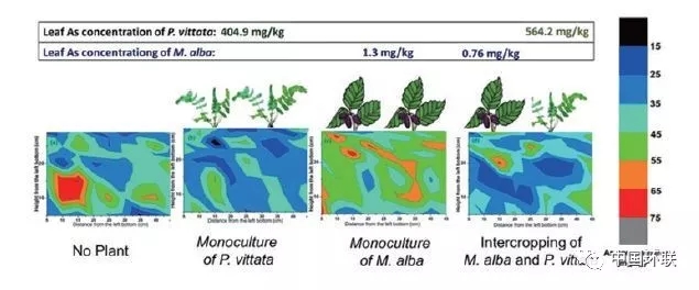 除降低可食作物對重金屬吸收外,在重金屬污染土壤上種植經(jīng)濟(jì)作物,阻控重金屬在食物鏈中的傳遞風(fēng)險(xiǎn),也是污染農(nóng)田安全利用的措施之一。華中農(nóng)業(yè)大學(xué)Yang等針對重金屬污染土壤研究重金屬耐性經(jīng)濟(jì)作物3種種植模式(油菜-向日葵、油菜-花生、油菜-芝麻),對土壤重金屬去除效應(yīng)和農(nóng)作物中重金屬濃度的影響進(jìn)行了研究。結(jié)果表明,油菜-向日葵種植模式去除Cd最高,可達(dá)459 g·ha-1,去除率為1.98%;利用正己烷提取后作物油符合相應(yīng)標(biāo)準(zhǔn),去油后種子殘?jiān)俳?jīng)酒石酸鉀提取后,其重金屬濃度低于飼料標(biāo)準(zhǔn)。經(jīng)濟(jì)作物與超積累植物間作,在安全生產(chǎn)的同時(shí)也能去除土壤污染物,實(shí)現(xiàn)修復(fù)目的。但是在超積累植物和其他植物間作體系下,超積累植物對重金屬活化和吸收機(jī)制還不清楚,超積累植物是否活化重金屬,增加非超積累植物對重金屬吸收。中國科學(xué)院地理科學(xué)與資源研究所Wan等開展了As超積累植物蜈蚣草和桑樹間作的研究,探討了邊生產(chǎn)邊修復(fù)機(jī)制。與單作相比,間作處理?xiàng)l件下蜈蚣草中As濃度顯著增加、桑樹As則顯著降低;對不同處理下土壤As的空間分布分析發(fā)現(xiàn),不論單作或間作處理蜈蚣草根周圍土壤As濃度較低,沒有活化土壤As(圖10),且在間作處理下桑樹葉中As濃度符合國家飼料標(biāo)準(zhǔn)。