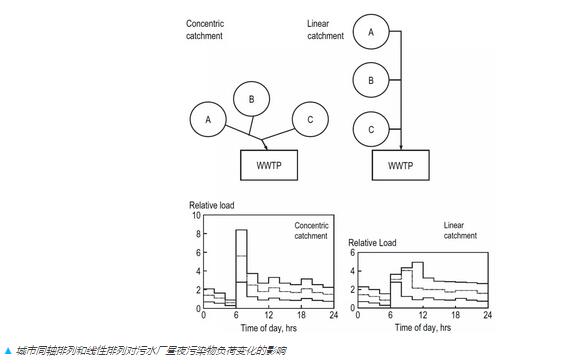 Gujer教授提醒我們污水處理系統(tǒng)除了污水處理廠之外,管網(wǎng)也是其重要的組成。污水廠的進水負荷變化在某程度是由于污染物進入管網(wǎng)時間的差異,以及管網(wǎng)分布的長度造成的,這兩個因素都跟時間這個變量有關(guān)。Gujer教授用下圖闡述了同軸排列和線性排列兩種排放模式的區(qū)別——前者的負荷變化更大,而后者的收集方式能使進水水質(zhì)更穩(wěn)定。由于晝夜負荷變化很大程度上控制了生物處理過程中的硝化性能,所以使用后者的城市規(guī)劃模式對該地區(qū)的污水處理是有好處的。
