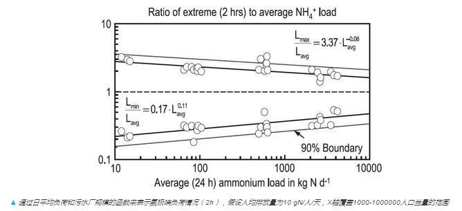 下圖總結(jié)了不同污水收集方式下氨的極端負荷和日平均負荷的比值。由于硝化處理設(shè)計的安全系數(shù)通常按照最大負荷和平均負荷的比值來設(shè)定,因此該圖能提供重要的設(shè)計信息。根據(jù)此圖,我們會發(fā)現(xiàn)安全系數(shù)的選定是個很有趣的事情——安全系數(shù)(也就是相應(yīng)的SRT)設(shè)定越大,污水廠的處理能力就變小,因此專業(yè)性就降低,而且更加難以運行。