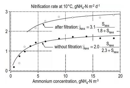 活性污泥工藝的硝化菌表面莫諾飽和系數(shù)大于MBR系統(tǒng)。但是Manser等人認為對于這個差別可以由傳質(zhì)作用解釋:活性污泥的絮體要比MBR的大,更長的擴散路徑導(dǎo)致更大的表面飽和值,因此這些動力學(xué)參數(shù)跟系統(tǒng)特性相關(guān)的。