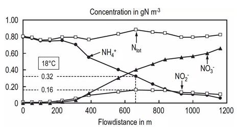 Gujer教授強調(diào),僅僅能夠預(yù)測污水的硝化表現(xiàn)是不夠的,更重要的是要弄清出水中氮的最終去向。下圖展示的是某富營養(yǎng)化湖泊的厭氧出水排入一條小溪后,其中的氮轉(zhuǎn)化達到接近靜態(tài)的所需距離。我們需要充足的空間才能發(fā)現(xiàn)自然凈化的數(shù)據(jù)。