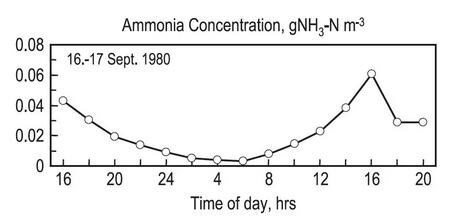 又如下圖所示,在距離某部分硝化的污水廠出水口1.5km的某河里的氨氮濃度晝夜差異。溫度、pH和氨氮負荷受到陽光的同步作用導(dǎo)致了這里的有毒物質(zhì)濃度的極端變化。
