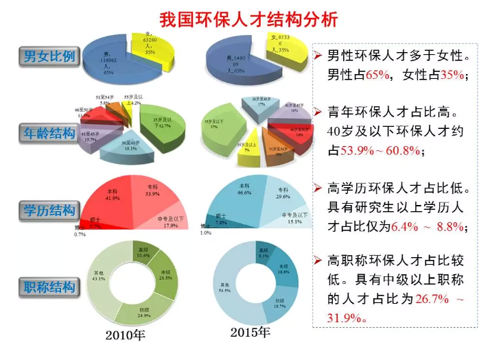 數(shù)據(jù)顯示,2010年我國(guó)環(huán)保系統(tǒng)(全國(guó)各級(jí)環(huán)保機(jī)關(guān)和直屬單位的從業(yè)人員)人才總量為17.9萬(wàn)人,其中環(huán)境監(jiān)測(cè)人才為33730人,環(huán)境執(zhí)法人才為60652人。到2015年,我國(guó)環(huán)保人才總量增長(zhǎng)為24.2萬(wàn)人,比2010年增長(zhǎng)6.3萬(wàn)人,增長(zhǎng)35%。其中環(huán)境監(jiān)測(cè)人才為70621人,比2010年增長(zhǎng)109.4%,環(huán)境執(zhí)法人才為79322人,比2010年增長(zhǎng)30.8%。