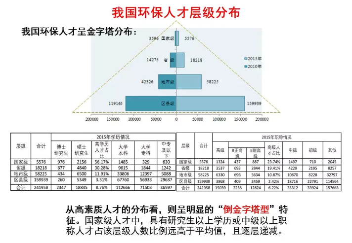 在這些環(huán)保人才中,男性占65%,女性占35%;青年環(huán)保人才占比高,高學(xué)歷、高職稱環(huán)保人才占比低。從高素質(zhì)人才的分布看,則呈明顯的“倒金字塔型”特征。國(guó)家級(jí)人才中,具有研究生以上學(xué)歷或中級(jí)以上職稱人才占該層級(jí)人數(shù)比例遠(yuǎn)高于平均值,且逐層遞減。