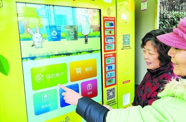 圖說:“綠色賬戶積分兌換機”前,居民用積分兌換禮品 來源/新民晚報記者 孫中欽 周馨 劉歆