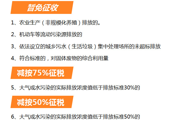 大氣或水污染:(《環(huán)保稅法》第十三條)納稅人排放應(yīng)稅大氣污染物或者水污染物的濃度值低于國家和地方規(guī)定的污染物排放標(biāo)準(zhǔn)30%的,減按75%征收環(huán)境保護(hù)誰。納稅人排放應(yīng)稅大氣污染物或者水污染物的濃度值低于國家和地方規(guī)定的污染物排放標(biāo)準(zhǔn)50%的,減按50%征收環(huán)境保護(hù)稅。