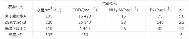 河北省某化工企業(yè)主要生產(chǎn)有機(jī)顏料,廢水來源主要是工藝廢水、廢氣吸收廢水、地面沖洗水、生活污水等。廢水按水質(zhì)可以分為4大類:第1類為高濃度廢水A(COD高、鹽分低),主要來源于精制廢水、濾洗廢水、粗品車間廢水,主要污染物為COD、苯系物等;第2類為高濃度廢水B(COD高、鹽分高),主要來源于結(jié)晶過濾廢水、濾洗廢水、精餾塔頂流出液、廢氣吸收廢水、粗品車間廢水、母液,主要污染物為COD、苯系物、二氯乙烷、二甲基甲酰胺、水合肼、鹽分等;第3類為低濃度廢水C,主要來源于消化廢水、水沖泵廢水、地面沖洗廢水、蒸餾放料槽廢水、蒸汽尾水、生活污水,主要污染物為COD、SS、氨氮、總磷、苯系物等;第4類為稀廢水D,主要來源于產(chǎn)品洗水,主要污染物為COD、SS等。根據(jù)廢水水質(zhì)不同先分質(zhì)處理,再合并處理。最終處理出水執(zhí)行《污水排入城鎮(zhèn)下水道水質(zhì)標(biāo)準(zhǔn)》(CJ343—2010)的B等級(jí)標(biāo)準(zhǔn)。各類廢水水質(zhì)水量如表1所示。