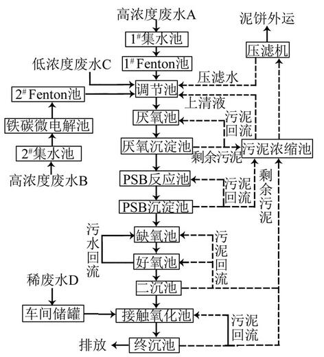 根據(jù)4類廢水水質(zhì),采取不同的方式進(jìn)行處理,最后混合進(jìn)入生化系統(tǒng)。高濃度廢水A首先匯入1#集水池,然后經(jīng)提升泵進(jìn)入1#Fenton池進(jìn)行氧化預(yù)處理,隨后進(jìn)入調(diào)節(jié)池。低濃度廢水C直接進(jìn)入調(diào)節(jié)池。高濃度廢水B首先匯入2#集水池,然后經(jīng)提升泵進(jìn)入鐵碳微電解池。
