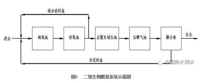 事實上經(jīng)過單級生物脫氮處理后,出水中仍會含有一定量的硝酸鹽,尤其是進水氨氮濃度高的情況下,出水中硝酸鹽的含量會更高,總氮也相應(yīng)偏高。在出水對總氮有嚴格要求的地區(qū),為保證出水總氮達標,在單級生物脫氮后再增設(shè)后置反硝化池和后曝氣池,亦即二級生物脫氮系統(tǒng),通過投加外加碳源,利用微生物的硝化和反硝化反應(yīng)進一步去除剩余的硝酸鹽,進而達到提高總氮去除率的目的。