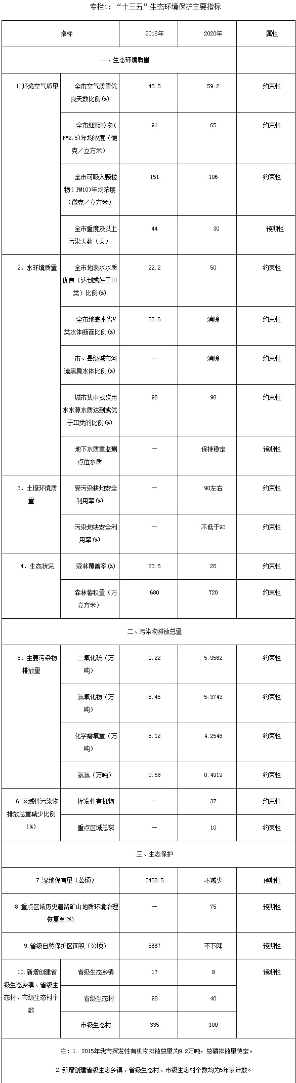1.我市生態(tài)環(huán)境質(zhì)量總體水平有待進一步提高。2015年,我市空氣質(zhì)量優(yōu)良天數(shù)比例、可吸入顆粒物年均濃度、細顆粒物年均濃度、重度污染天數(shù)等指標雖較“十一五”有較大程度改善,但仍然不容樂觀。全市地表水水質(zhì)優(yōu)良比例和劣V類水體斷面的比例指標仍有較大的改善空間。