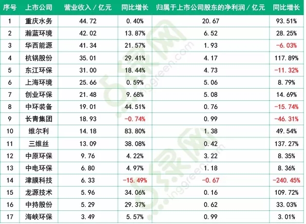 截止4月3日止共有17家環(huán)保上市公司發(fā)布2017年年報(其余將繼續(xù)跟進(jìn))。2017年營收排名靠前重慶水務(wù)、瀚藍(lán)環(huán)境、華西能源均在40億以上,營收僅津膜科技和長青集團(tuán)同比下降。