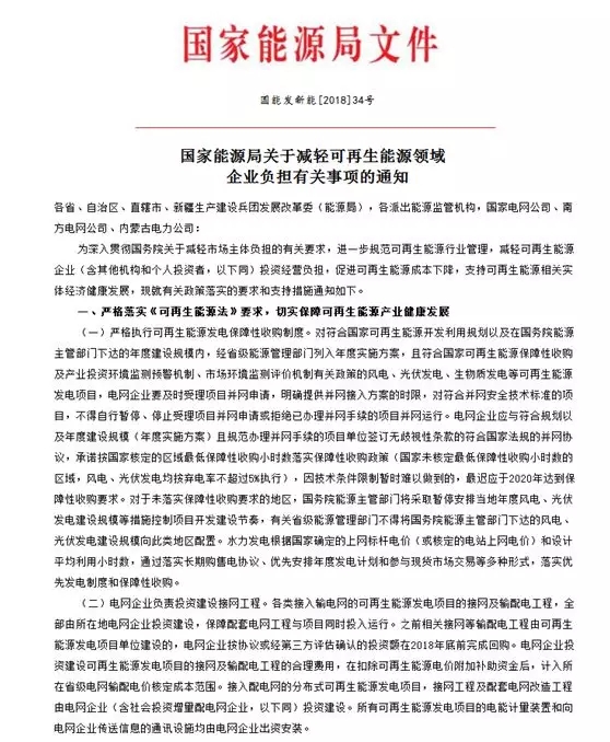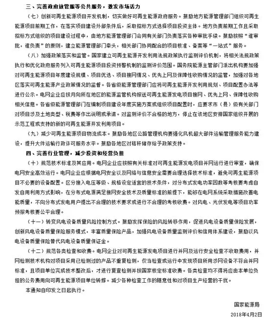 2018年4月26日,國家能源局官網(wǎng)公布《關(guān)于減輕可再生能源領(lǐng)域企業(yè)負(fù)擔(dān)有關(guān)事項的通知》,進一步規(guī)范可再生能源行業(yè)管理,減輕可再生能源企業(yè)(含其他機構(gòu)和個人投資者)投資經(jīng)營負(fù)擔(dān),促進可再生能源成本下降。