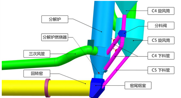 窯尾脫硝燒成系統(tǒng)需對四級旋風(fēng)筒下料管在分解爐下料點(diǎn)的位置需要進(jìn)行優(yōu)化,四級旋風(fēng)筒下料管對分解爐下料點(diǎn)位于三次風(fēng)管之上,高于三次風(fēng)管0.5米以上,將每列單管下料,更改為雙管下料,每單列增加一套分料閥、翻板閥、撒料箱及相應(yīng)的下料管延長。其目的是將相對低溫物料下移,吸收還原區(qū)高溫,凝聚窯氣中析出的堿硫等有害成分,防止結(jié)皮的發(fā)生。
