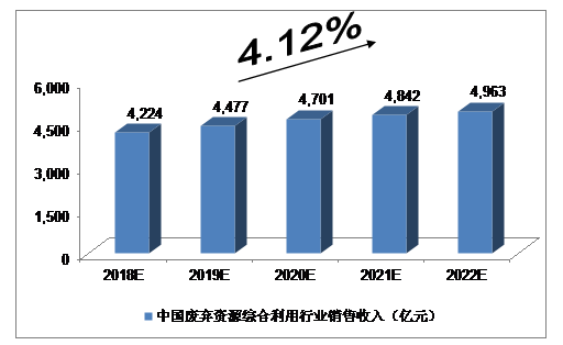 我們預(yù)計,2018年中國廢棄資源綜合利用行業(yè)銷售收入將達(dá)到4,224億元,未來五年(2018-2022)年均復(fù)合增長率約為4.12%,2022年將達(dá)到4,963億元。