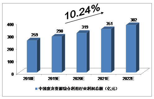 我們預(yù)計,2018年中國廢棄資源綜合利用行業(yè)利潤總額將達(dá)到259億元,未來五年(2018-2022)年均復(fù)合增長率約為10.24%,2022年將達(dá)到382億元。