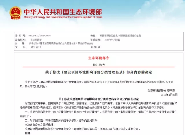 生態(tài)環(huán)境部2018年第3次部務(wù)會(huì)審議并通過了《關(guān)于修改<建設(shè)項(xiàng)目環(huán)境影響評(píng)價(jià)分類管理名錄>部分內(nèi)容的決定》,對(duì)《建設(shè)項(xiàng)目環(huán)境影響評(píng)價(jià)分類管理名錄》(環(huán)境保護(hù)部令第44號(hào))的部分內(nèi)容予以修改,并于公布之日起實(shí)施。