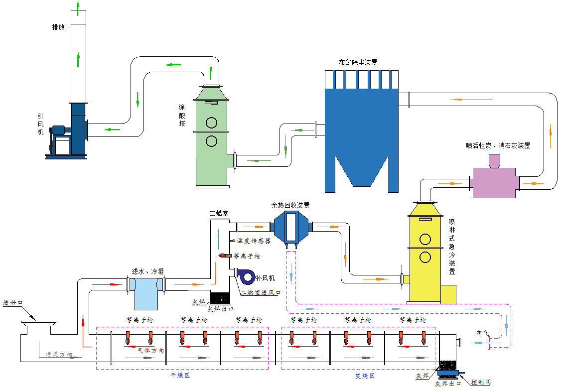 等離子火炬污泥焚燒裝置由等離子火炬、等離子火炬電源、進(jìn)出料裝置、隧道窯(由多個(gè)窯爐單元組合而成)、攪拌輸送、尾氣處理系統(tǒng)組合而成。(如圖所示)