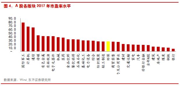 從估值水平來看,以2018年4月27日收盤價作為測算標準,全部A股2017年業(yè)績對應的PE水平為17.3倍,環(huán)保板塊PE為26.9倍,處于所有板塊的平均水平。結(jié)合環(huán)保板塊的業(yè)績高增長趨勢,我們認為環(huán)保板塊的估值屬于比較合理的水平。