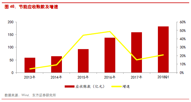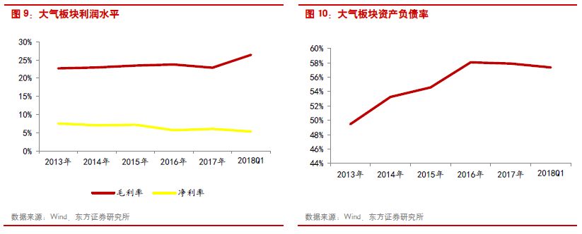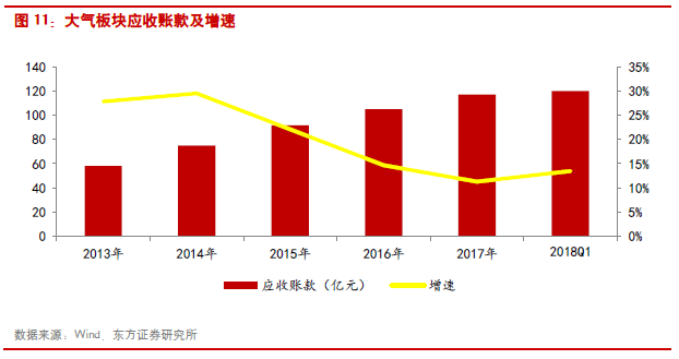 大氣治理板塊2017年收入和歸母凈利潤分別同比增長9.73%和16.95%;2018年Q1收入增速9.24%,凈利潤增速-3.65%。行業(yè)整體的利潤體量較2016年有所好轉(zhuǎn)主要是由于科融環(huán)境和龍源技術(shù)業(yè)績扭虧為盈所致(科融環(huán)境和龍源技術(shù)2016年凈利潤分別為-1.32和1.64億元),但合計利潤體量占到大氣治理板塊近9成的龍凈環(huán)保和清新環(huán)境的利潤增速卻相對有限,低于其他板塊的龍頭公司,其中龍凈環(huán)保的利潤增速為9.10%,而清新環(huán)境則同比下滑12.44%。大氣治理板塊由于費用率增加,凈利率已降至5.33%。行業(yè)資產(chǎn)負債率也基本保持在57%左右。應收賬款方面,由于大部分大氣治理項目開始進入運營階段,所以行業(yè)整體應收賬款增速開始放緩,2017年增速約為11%。