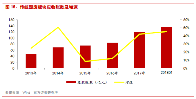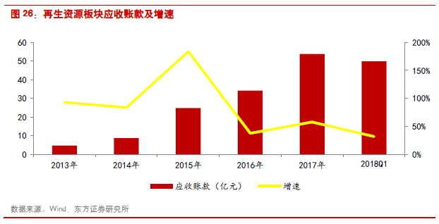 傳統(tǒng)固廢:由于盛運環(huán)保2017年出現(xiàn)重大的業(yè)績變化(2016年歸母凈利潤為1.19億,2017年虧損13.18億),在統(tǒng)計傳統(tǒng)固廢處置板塊時剔除了盛運環(huán)保的影響。因此傳統(tǒng)固廢處置板塊2017年的收入和利潤增速分別為27.95%和15.53%。收入增速為最近三年最高,主要得益于環(huán)衛(wèi)、危廢等業(yè)務的收入占比的提升,而凈利潤增速低于營業(yè)收入的增速主要是因為環(huán)衛(wèi)業(yè)務增長的初期,項目的毛利率相對有限。從利潤水平看,傳統(tǒng)固廢的毛利率基本保持在30%左右,但由于運營、銷售和財務費用的增加,導致行業(yè)的凈利率水平呈現(xiàn)下滑趨勢,2017年凈利率為13.78%。行業(yè)資產(chǎn)負債率基本保持55%左右。應收賬款方面,由于每年仍有垃圾焚燒工程以BOT模式進入開工建設期,所以行業(yè)的應收賬款增速上升,2017年增速達到42.13%。