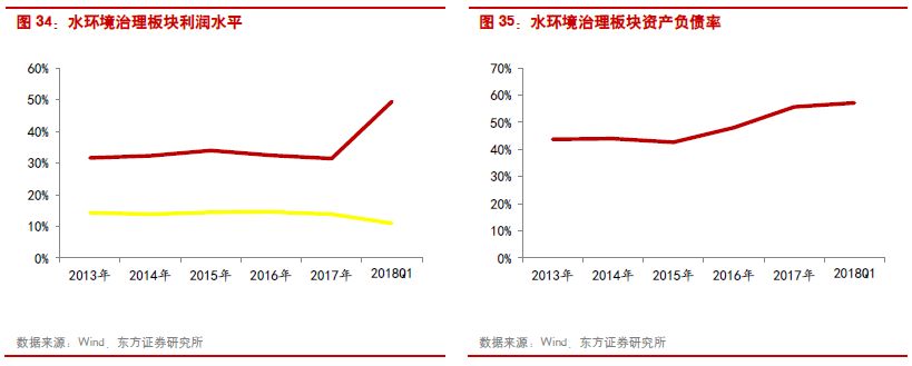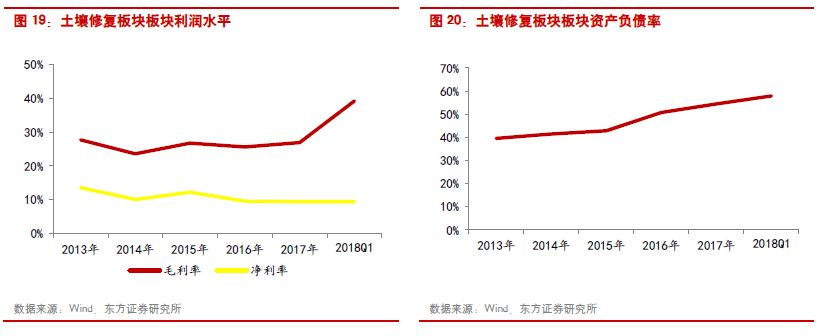 土壤修復:由于全國土壤污染普查尚未結(jié)束,且“十三五”前中期的環(huán)保治理重點在煙氣治理和水環(huán)境綜合治理,因此2017年土壤修復行業(yè)新增訂單較少,土壤修復板塊2017年的收入和利潤增速分別為13.98%和12.57%,明顯低于2016年同期水平。由于拓展了PPP的業(yè)務,行業(yè)資產(chǎn)負債率呈現(xiàn)上升趨勢,2017年資產(chǎn)負債率為57.94%,比上一年同期增加了近3個百分點。