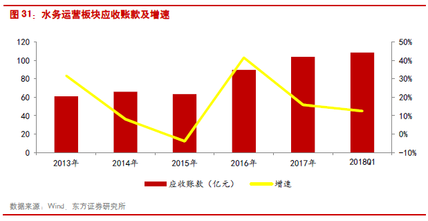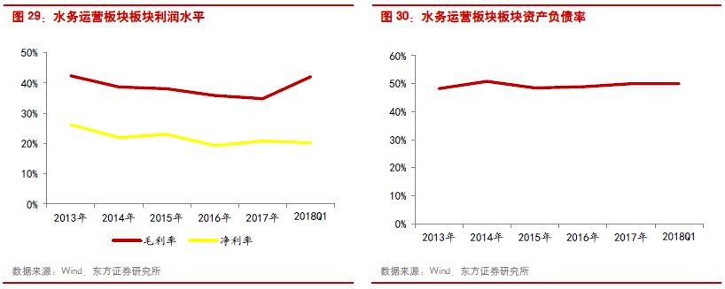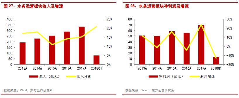 傳統(tǒng)水務運營:傳統(tǒng)水務2017年和2018Q1實現(xiàn)收入增速分別為15.19%和20.89%,歸母凈利潤同比增長23.92%和-13.14%。由于受到增值稅政策調(diào)整的影響,傳統(tǒng)水務板塊2016年業(yè)績?yōu)樨撛鲩L,但2017年以后增值稅對于行業(yè)的影響基本消除,行業(yè)回到20%左右的利潤增速水平。個股方面,重慶水務由于污水處理業(yè)務增值稅及附加稅費、污水處理業(yè)務增值稅即征即退、收到實際承擔污水增值稅及附加稅費的補助等事項影響,歸母凈利潤同比增長93.51%至20.67億元。