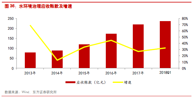 水環(huán)境治理:水環(huán)境治理是環(huán)保中涉及PPP影響最大的細分領域,2017年在PPP項目管理庫持續(xù)擴容的大背景下,水環(huán)境治理相關的上市公司實現(xiàn)了訂單大幅增長,并有效地轉(zhuǎn)化成了公司的收入。同時2017年下半年以來財政部限制地方債務和規(guī)范PPP的相關政策法規(guī)對環(huán)保類PPP項目的影響相對有限,因此2018Q1延續(xù)了行業(yè)的高景氣度。水環(huán)境治理板塊2017年收入增速48.03%,歸母凈利潤增速40.54%;2018年Q1收入增速61.92%,歸母凈利潤增速0.13%。板塊的利潤水平基本保持穩(wěn)定,毛利率30%左右,受財務費用增長影響,凈利率降至13.84%。由于水環(huán)境治理類PPP項目對企業(yè)的資金能力要求較高,行業(yè)融資需求加大,2017年板塊的資產(chǎn)負債率由上一年的48.06%增長到55.69%。2017年應收賬款增速為26.99%,略高于其他環(huán)保板塊。