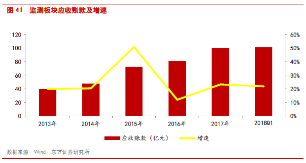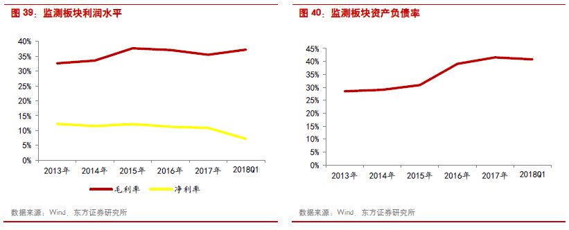 受益于全國范圍內(nèi)的環(huán)保督查帶動新的監(jiān)測需求,監(jiān)測板塊維持較高的行業(yè)景氣度。2017年收入同比增長38.45%,歸母凈利潤同比增長33.58%。受銷售費用、財務費用增加影響,凈利率略下滑至10.87%。由于監(jiān)測企業(yè)基本通過外延并購來拓展產(chǎn)品和業(yè)務范圍,所以融資需求逐漸增加,行業(yè)的資產(chǎn)負債率由2016年的39.04%略上升到2017年的41.55%。