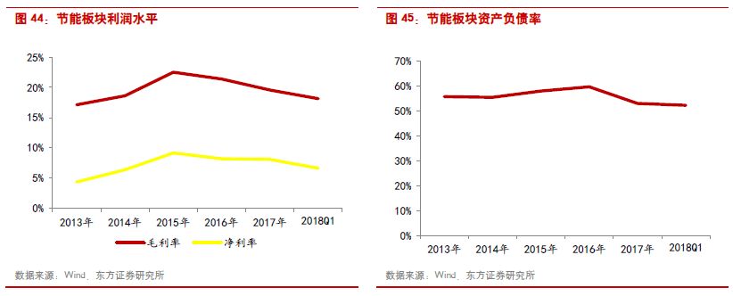 節(jié)能版塊2017年收入和歸母凈利潤增速分別為15.35%和13.61%;2018Q1收入和歸母凈利潤分別下滑10.32%和16.31%。板塊的利潤水平呈下降趨勢,2015年、2016年、2017年毛利率分別為22.52%、21.38%、19.55%;凈利潤分別為9.16%、8.22%、8.10%。由于節(jié)能項目普遍投資體量較大,板塊的資產(chǎn)負債率基本維持在58%-60%,屬于環(huán)保細分領域中較高的水平。受神霧環(huán)保和神霧節(jié)能業(yè)績下滑影響,2018Q1節(jié)能版塊整體收入和利潤大幅下滑。