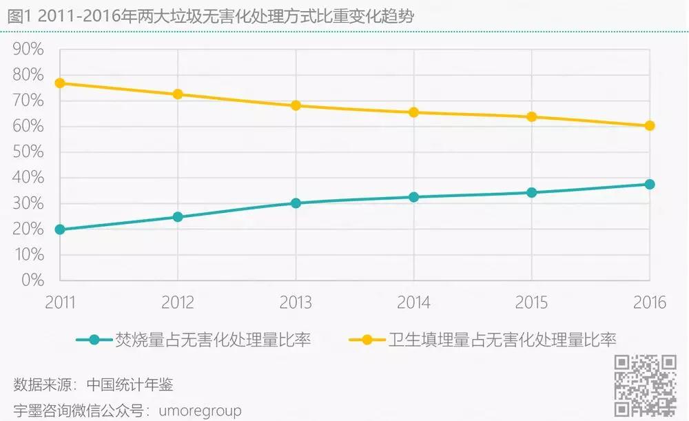 由于各地區(qū)可用于垃圾填埋的用地越來越少,垃圾圍城面臨的困境亟待解決,國家開始支持垃圾焚燒發(fā)電廠的建設(shè)。宇墨統(tǒng)計了近5年來我國城市生理垃圾無害化處理設(shè)施數(shù)量,其中垃圾焚燒發(fā)電廠數(shù)量高速增長年均增速達(dá)18%,與此同時垃圾焚燒占無害化處理比率快速上升,而衛(wèi)生填埋處理占比持續(xù)下降。宇墨依據(jù)最近6年來垃圾焚燒比率的線性增速,預(yù)計至2020年垃圾焚燒處理的模式占無害化處理量將達(dá)到55.8%,達(dá)到官方在2016年底出臺的“十三五”全國城鎮(zhèn)生活垃圾無害化處理設(shè)施規(guī)劃中提出的50%目標(biāo)壓力不大。