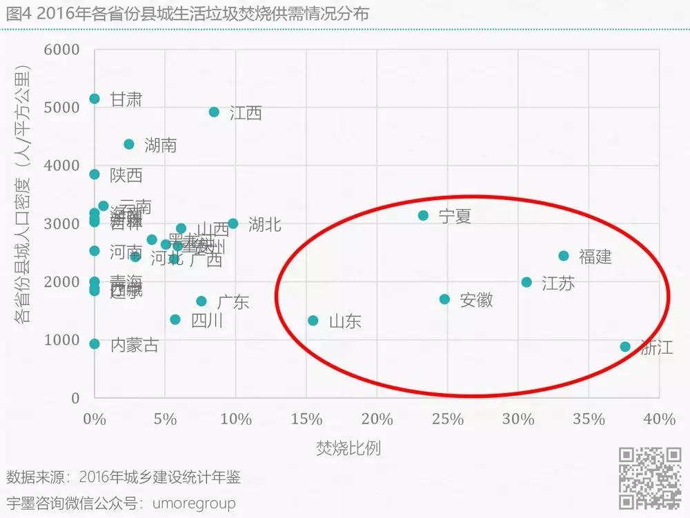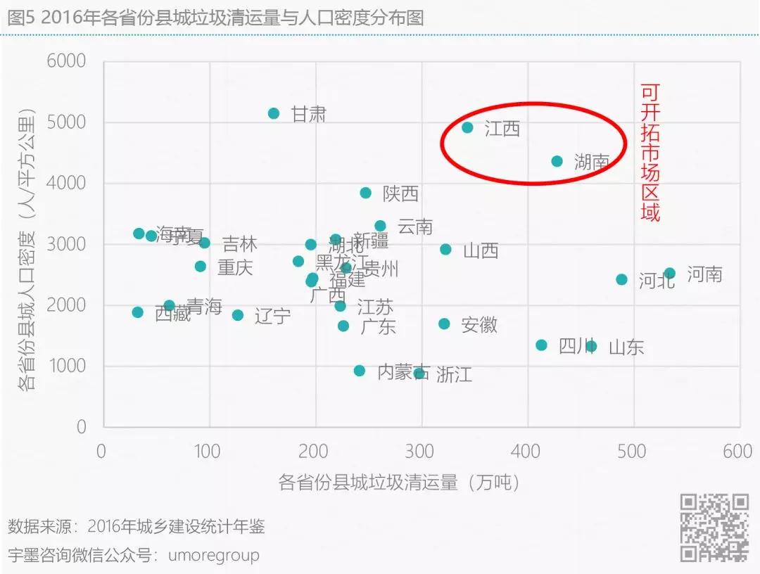接下來從各省份縣域維度分析,從城建部的數(shù)據(jù)來看全國各個省份的生活垃圾無害化處置率基本都維持在70%以上,但是除了上海、江蘇、浙江、安徽、山東、寧夏這六個省市區(qū)外,其余地區(qū)焚燒處置垃圾比率均不足10%(圖4),而甘肅、江西、湖南三個省份縣城人口密度最高,焚燒比率缺口相對較大。另一方面,一個地區(qū)的垃圾清運量理應(yīng)與地區(qū)的人口密度成正比,但是由于中國縣級以下地區(qū)人口遷移度大,戶籍人口密度與常住人口密度出入存在一定差異,因此從圖6可看在甘肅地區(qū)垃圾清運較低但人口密度偏高的地區(qū),人口外流比例會相對較高,當(dāng)然這里也不排除各地市人均垃圾產(chǎn)生量有較大差異。宇墨通過對各省份縣城垃圾清運量與各省份縣城人口密度分布的分析(圖5),推斷在人口密度相對高且垃圾產(chǎn)生量相對較多的江西和湖南兩省份的縣城區(qū)域開辟垃圾焚燒發(fā)電市場相對較容易,而在這些省份縣城中那些旅游景區(qū)及高校等區(qū)域或有更多的垃圾供給。畢竟對于縣級鄉(xiāng)級地市建設(shè)垃圾焚燒發(fā)電廠有一大難題,當(dāng)焚燒廠建好后,由于垃圾產(chǎn)生量不足而造成的垃圾發(fā)電廠無法長期運營的情況對企業(yè)來說乃是硬傷,且在《“十三五”全國城鎮(zhèn)生活垃圾無害化處理設(shè)施建設(shè)規(guī)劃》中已提出不鼓勵建設(shè)處理規(guī)模小于300噸/日的焚燒設(shè)施。對于想要進(jìn)軍縣級區(qū)域開辟市場的企業(yè)來說,如何有效收集垃圾以及降低收運成本使得焚燒廠實現(xiàn)滿負(fù)荷工作將是主要考慮因素。