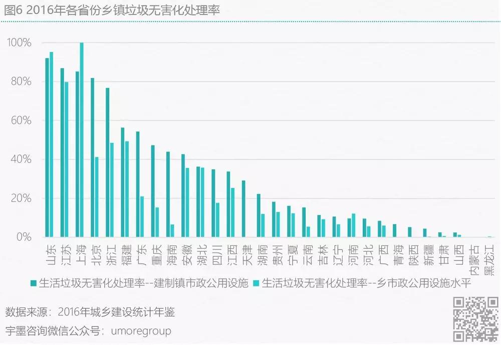 最后,從鄉(xiāng)鎮(zhèn)維度分析,各地區(qū)基本沒有垃圾焚燒發(fā)電的處置方式,而垃圾填埋則為垃圾無害化處置中占比最高的方式,依據(jù)數(shù)據(jù)來看,各省份鄉(xiāng)鎮(zhèn)垃圾的無害化處置占比各地比率存在較大差異,浮動區(qū)間在10-100%之間。中國城市建設(shè)研究院總工程師徐海云指出,農(nóng)村地區(qū)在現(xiàn)有生活垃圾填埋場選址上建設(shè)垃圾焚燒發(fā)電廠將是優(yōu)先選擇,且由于我國各地鄉(xiāng)鎮(zhèn)地區(qū)的人口流動性的差異以及不可控,此處將僅依據(jù)各省份的無害化處置比重來推測各省份鄉(xiāng)鎮(zhèn)垃圾焚燒發(fā)電市場機遇。如圖6所示,在山東、江蘇、上海、北京、浙江、福建、廣東、重慶、海南、安徽這些地方的鄉(xiāng)鎮(zhèn)地區(qū)有相對較大的垃圾焚燒發(fā)電市場缺口。