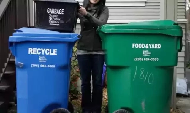 然后裝進(jìn)不同顏色的垃圾桶里,