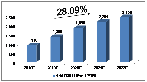 綜合以上因素,我們預(yù)計(jì),2018年中國(guó)汽車報(bào)廢量將達(dá)到910萬輛,未來五年(2018-2022)年均復(fù)合增長(zhǎng)率約為28.09%,2022年中國(guó)汽車報(bào)廢量將達(dá)到2450萬輛。