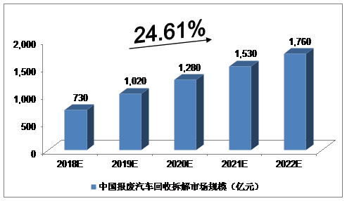 綜合以上因素,我們預(yù)計(jì),2018年中國(guó)報(bào)廢汽車回收拆解市場(chǎng)規(guī)模將達(dá)到730億元,未來五年(2018-2022)年均復(fù)合增長(zhǎng)率約為24.61%,2022年中國(guó)報(bào)廢汽車回收拆解市場(chǎng)規(guī)模將達(dá)到1760億元。