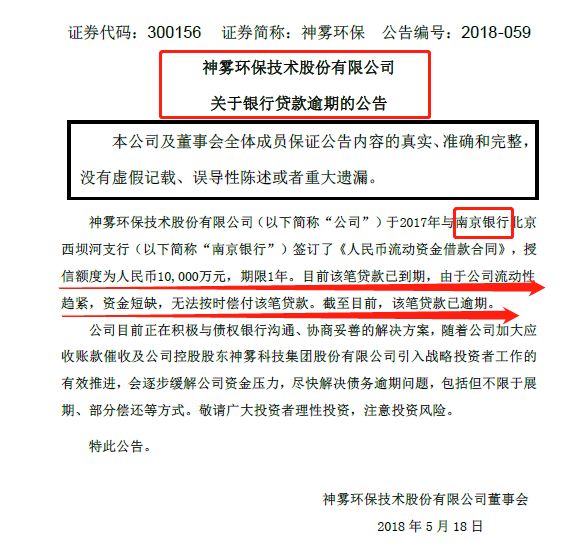 5月19日,神霧集團(tuán)公告稱,近日收到控股上市子公司神霧環(huán)保銀行貸款逾期事項(xiàng)。神霧環(huán)保南京銀行1億元貸款已到期,由于神霧環(huán)保流動(dòng)性趨緊,資金短缺,無法按時(shí)償付該筆貸款,截至目前該筆貸款已逾期。