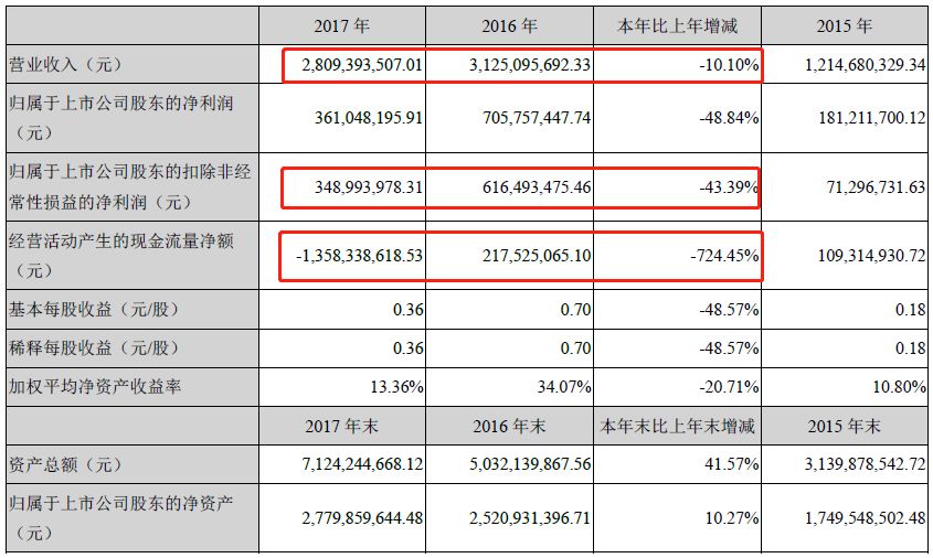 神霧環(huán)保2017年財(cái)報(bào)顯示,截止2017年末,神霧環(huán)??偁I(yíng)收28.09億元,與上年同期相比減少10.10%,歸屬母公司的凈利潤(rùn)3.61億元,與上年同期相比減少48.84%,經(jīng)營(yíng)活動(dòng)產(chǎn)生的現(xiàn)金流量?jī)纛~-13.58億元,與上年同期相比減少724.45% ,營(yíng)收能力和盈利能力顯著下降,流動(dòng)資金十分緊張。
