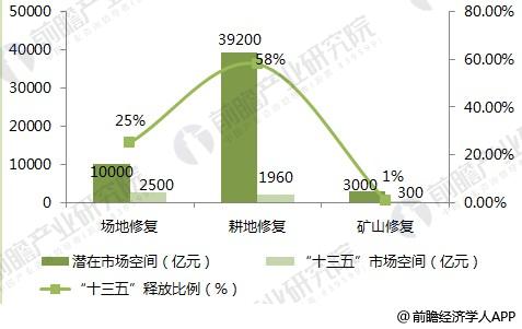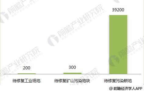 前瞻產(chǎn)業(yè)研究院發(fā)布的《2018-2023年中國生態(tài)修復行業(yè)市場前瞻與投資戰(zhàn)略規(guī)劃分析報告》顯示,根據(jù)國家“到2020年現(xiàn)有位于城鎮(zhèn)內(nèi)人口密集區(qū)域的?;飞a(chǎn)企業(yè)全部啟動搬遷改造”的指標,可以推測我國有待修復的工業(yè)場地存量200萬畝,根據(jù)招投標現(xiàn)狀來看,每塊地修復成本從百萬至千萬甚至上億不等,保守估計以每畝地20-50萬元價格來估算,則場地修復市場空間將達到1萬億元;我國的待修復礦山污染地塊在300萬畝左右,保守估計以每畝地5-10萬元左右價格垃圾進行估算,則礦山修復市場空間將達到3000億元左右;待修復的污染耕地面積約為3.92億畝,每畝耕地修復價格以1萬元為計算,則污染耕地修復市場空間為3.92萬億??傆媮砜矗@三類待修復土壤潛在市場空間達5.22萬億元。