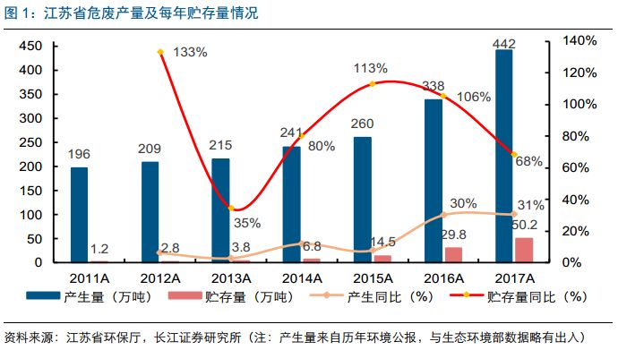 江蘇省危廢產量在2011-2015年增速平穩(wěn),2016年增速明顯反彈與國家更新危廢名錄有關;2017年再次同比增31%達442萬噸,與中央環(huán)保督察關系密切。江蘇省危廢貯存量由2011年的1.2萬噸增長至2017年50.2萬噸,2016-2017年增量較大,考慮到危廢貯存不超過1年及大量潛在危廢曝光,預計大量非法存儲及處置危廢轉向正軌渠道,危廢需求有望加速釋放。